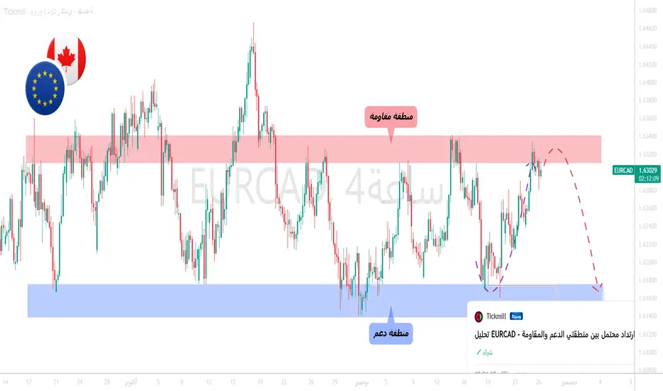 يتداول زوج EURCAD داخل نطاق واضح بين منطقة الدعم الزرقاء ومنطقة المقاومة الحمراء. وبعد الارتداد الأخير من الدعم، عاد السعر للاقتراب من منطقة المقاومة التي رفضته عدة مرات سابقًا، مما يجعلها منطقة مفصلية للحركة القادمة.