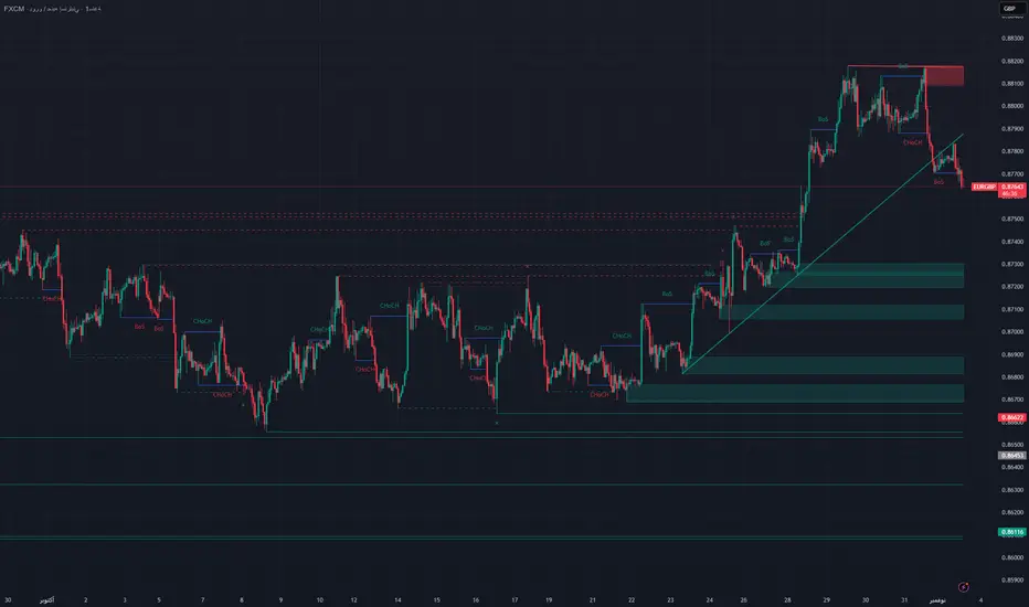 الزوج يقترب الآن من منطقة دعم بين 0.8750 – 0.8740، والتي تتطابق مع منطقة طلب سابقة، ما يجعلها نقطة ارتداد محتملة إذا استعاد المشترون السيطرة.