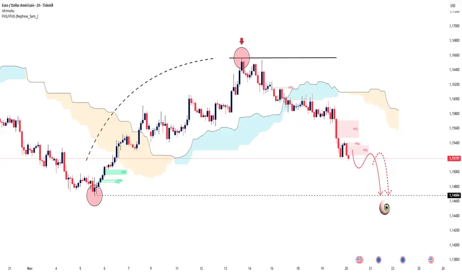 Prix verrouillé en dessous du nuage Ichimoku. Les zones FVG 1,1535 – 1,1560 sont devenues la zone de retest parfaite pour la pression de vente. Il n’y a aucun signe de récupération de liquidités auprès des acheteurs.