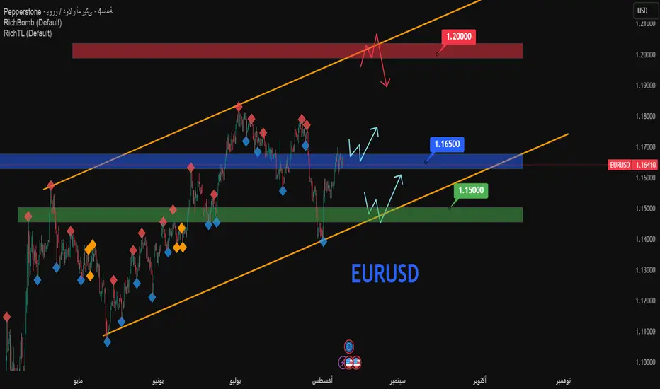 يستقر سعر اليورو دولار عند منطقة 1.1650 باللون الأزرق التي تشكل منطقة مهمة لإرتداد السعر هبوطا أما إختراق هذه المنطقة صعودا يشكل يستكمل السعر الموجة الصاعدة نحو خط الترند العلوي للقناة.