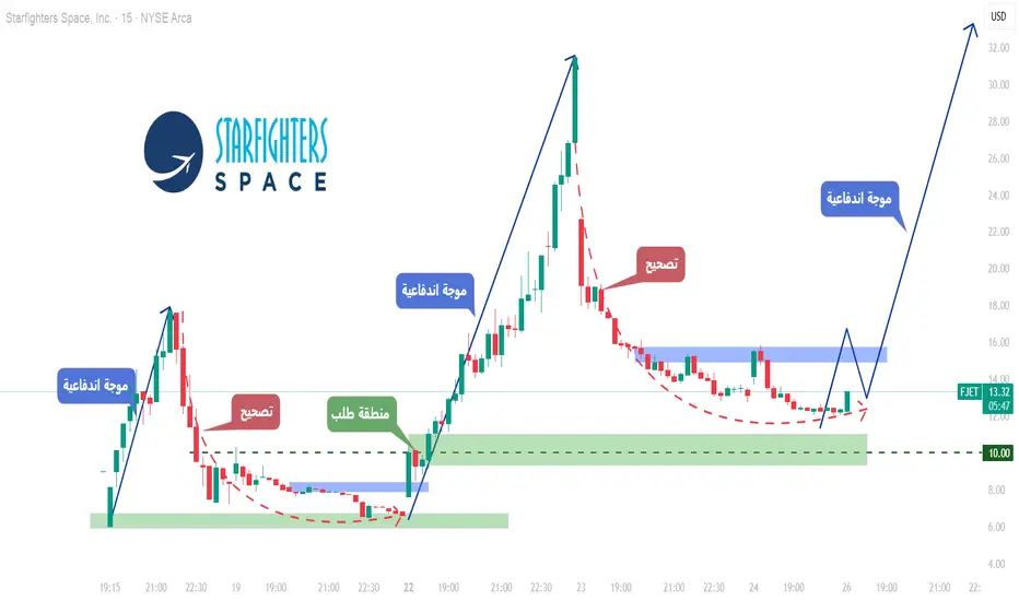 يتداول FJET حاليًا داخل تصحيح منحني آخر، مع ميل تدريجي نحو الأسفل باتجاه منطقة طلب جديدة بين 10 و11. والأهم أن هذا التصحيح يأتي بزخم هبوطي متناقص، ما يشير إلى امتصاص بيعي لا إلى بيع عدواني.