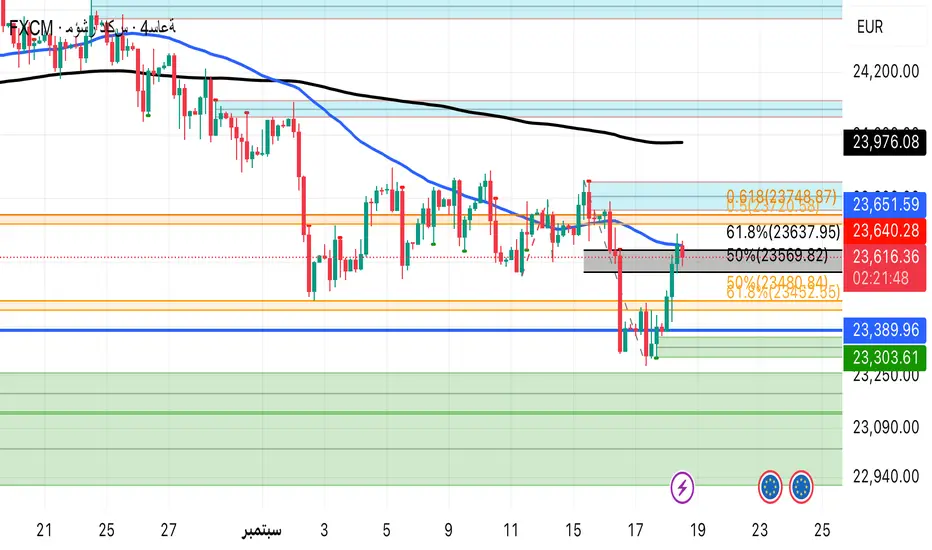 • السعر ارتد من مناطق الطلب (23,300 – 23,400) ويتجه الآن لاختبار مقاومة مؤسسية قوية قرب 23,750 – 23,900.
