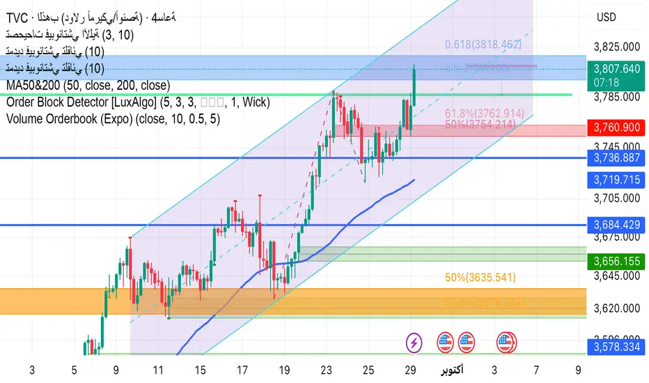 • الهدف القادم = 3815–3820 (منطقة 0.618 فيبو + سيولة أعلى القمم).