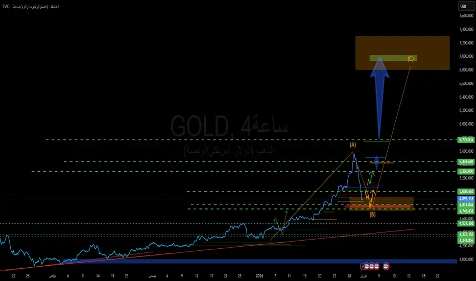 الحركة الحالية على الذهب ليست انعكاسًا هابطًا، بل تفريغ سيولة بعد قمة (A) وإعادة السعر إلى منطقة قرار بنيوية (B).
