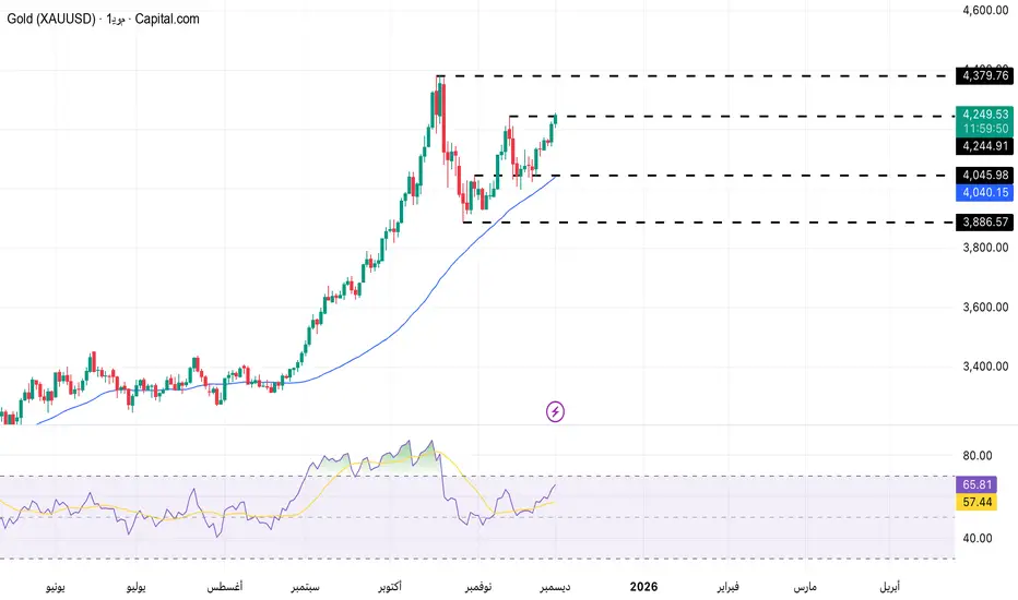 يبدأ الذهب أسبوعه بالارتفاع مباشرة نحو القمة المسجّلة في أوائل نوفمبر، ليقدّم اختبارًا مباشرًا لقوة الاتجاه الصاعد مع انطلاق شهر ديسمبر. ومع تحسّن الزخم تدريجيًا، أصبح لدى المتداولين مجموعة واضحة من المستويات التي يمكن الاعتماد عليها مع بداية الشهر الجديد.
