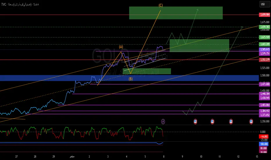 السعر الحالي 3585$ يتداول داخل قناة صاعدة بعد ارتداد من منطقة (B) واندفاع نحو (C). النموذج الموجي يشير إلى استكمال الموجة الصاعدة مع أهداف أولية 3603 → 3625 → 3659 وصولًا إلى 3698$، مع دعم محوري عند 3552$ ثم 3471$.