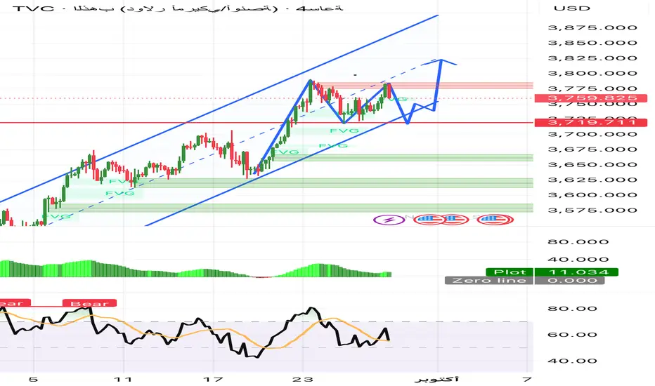 • وجود FVG (Fair Value Gaps) كثيرة أسفل السعر، أبرزها عند 3680 – 3700$ و 3600 – 3620$، مما يشير لاحتمال تغطية الفجوات لاحقاً.