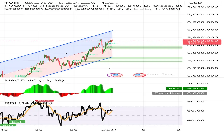 الذهب يتحرك داخل قناة صاعدة، لكنه وصل إلى حدودها العليا قرب مستوى 3880، ما يجعله في منطقة حساسة إما للارتداد هبوطاً أو محاولة اختراق صاعد.