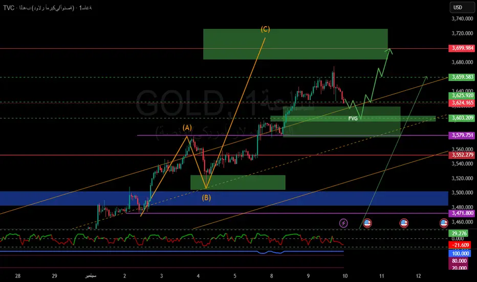 الرسم يوضح نموذج تصحيحي (A-B-C) مع منطقة طلب (FVG) عند 3603–3590 قد تُعيد السعر للانطلاق.