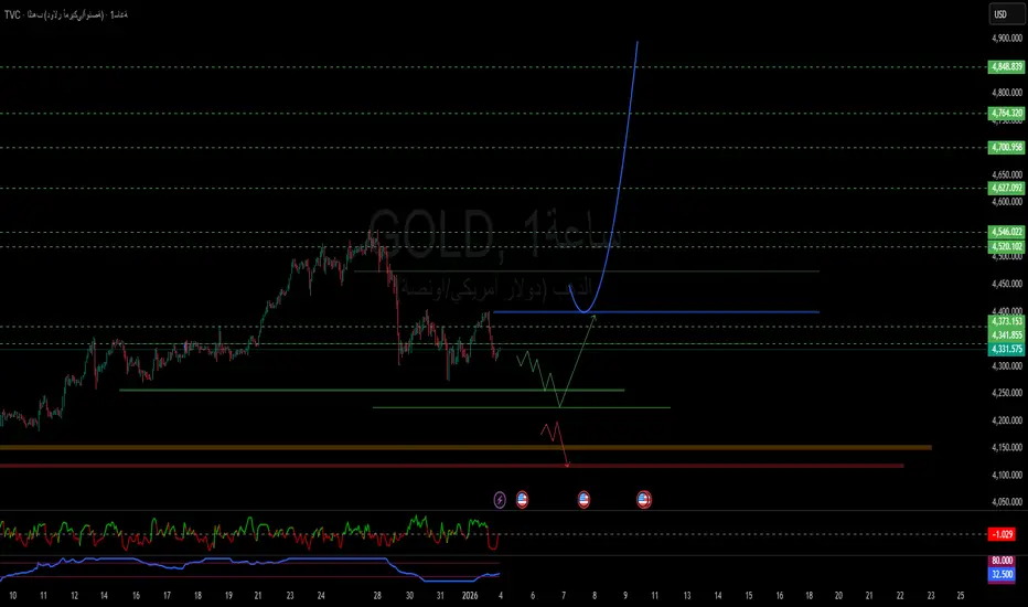 كسر واضح وإغلاق أسفل 4,310 → عودة ضغط نحو 4,250 – 4,200 قبل أي محاولة توازن جديدة.