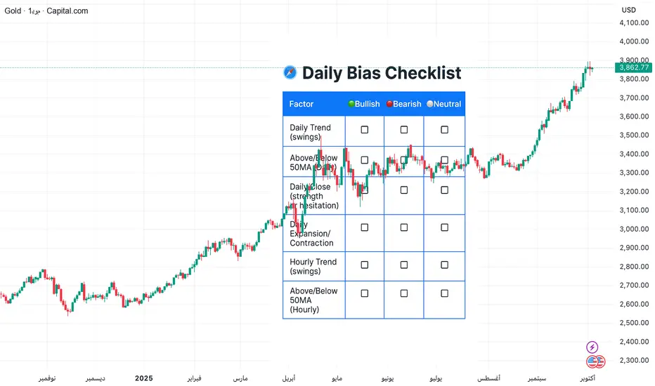 إليك جدولًا بسيطًا يُستكمل قبل كل جلسة: ضع علامة على صعودي، هبوطي أو محايد لكل عامل. وبعدها لخص النتائج في ملخص من جملتين فقط.
