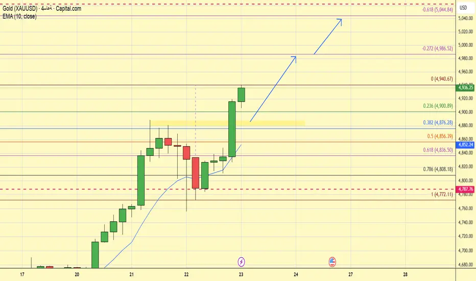 انخفض سعر الذهب أمس ثم ارتد من مستوى 4780. تجاوز السعر جميع مستويات المقاومة ووصل إلى أعلى مستوى له على الإطلاق. كان الارتفاع قوياً للغاية. أعتقد أنه في طريقه إلى 5000 دولار. لذلك، سأشتري بين 4890 و4900 دولار. الهدف الأول 4986 دولار، والهدف النهائي 5044 دولار.