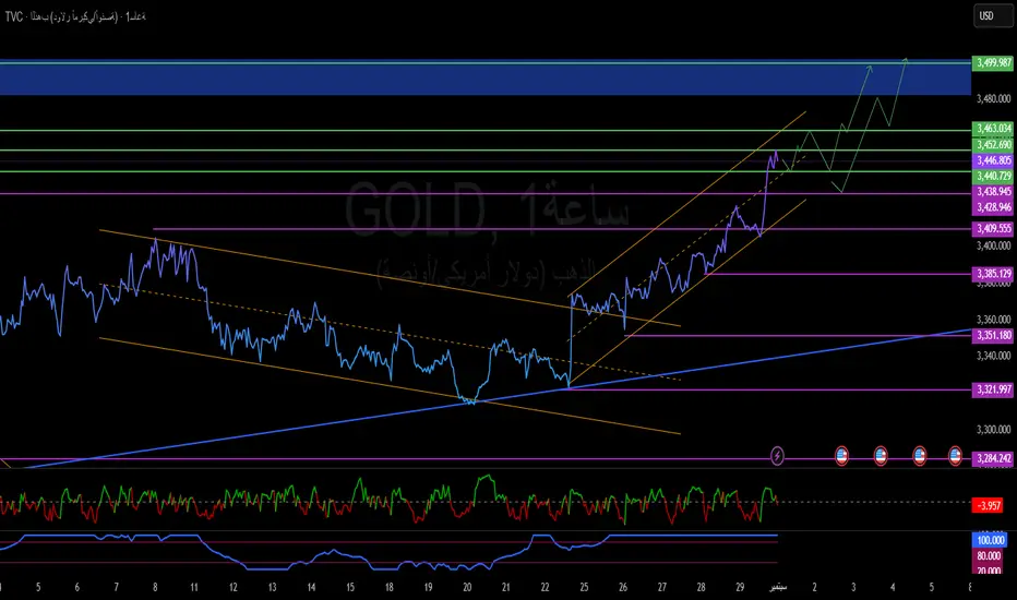 الذهب في قناة صاعدة لا تزال عطشى للاختراق. السيناريو الأقوى هو صعود متدرج حتى 3463، ثم اختبار جدار 3499. أي عودة إلى 3409 لن تكون هزيمة، بل إعادة شحن للانفجار القادم.