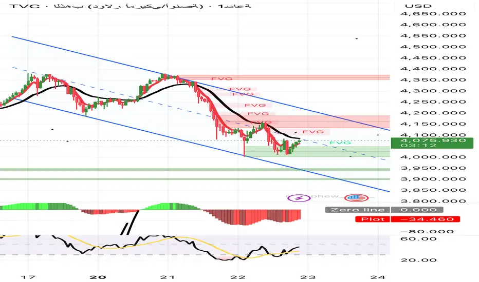 السعر يتحرك داخل قناة هابطة واضحة، لكنه الآن يختبر الحد السفلي ويظهر محاولات ارتداد من منطقة دعم قوية بين 4,000 و4,050.