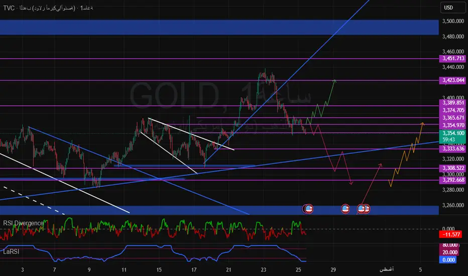 بكسر دعم 3354، نترقّب هبوطًا تدريجيًا نحو 3333 – 3300 – مع منطقة ارتداد محتملة من 3260–3280 (باللون الأزرق).