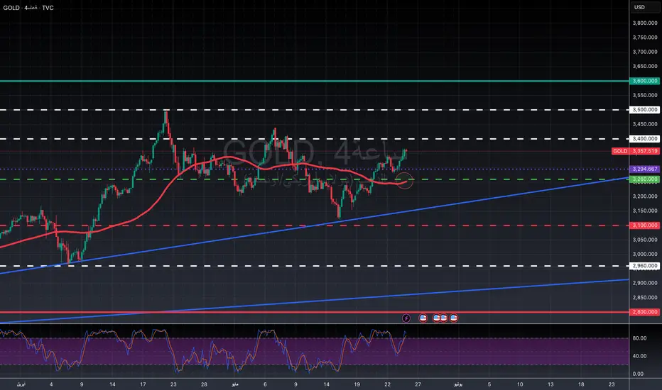 XAU/USD – شراء | الدخول: 3357 | الهدف الأول: 3400 | الهدف الثاني: 3600 | وقف الخسارة: 3294