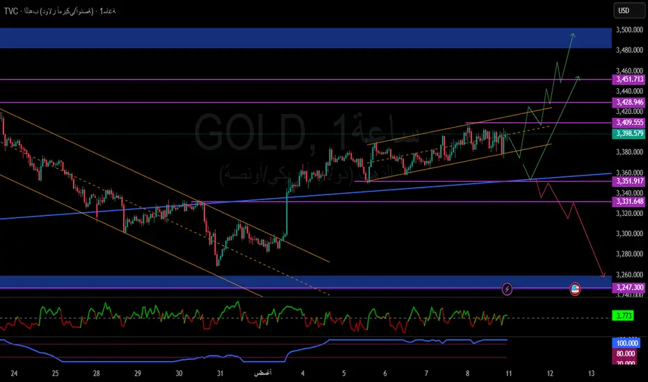 الذهب الآن في لحظة أشبه بالهدوء قبل العاصفة… يتحرك داخل قناة صاعدة فرعية (📈) بعد كسر القناة الهابطة الرئيسية (📉)، ويتداول حاليًا قرب 3398. نحن أمام منطقة قرار، حيث تتقاطع مستويات العرض والطلب، وتتصادم سيولة المشترين مع جدران البائعين.