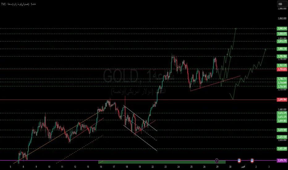 السيناريو الأول (الملحمي): الذهب يواصل من 3760 مباشرة نحو 3785 ثم 3800، ليكسر جدار الوعي ويفتح الطريق إلى 3830 – 3840.