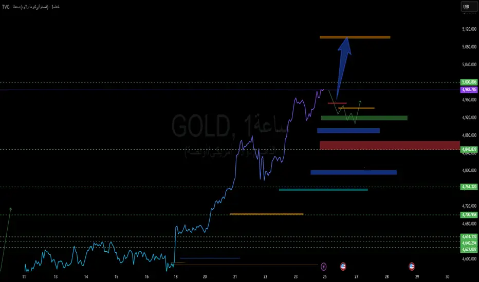 السعر حاليًا يتداول قرب 4983 – 4988 بعد صعود قوي متسلسل متتابعة، ما يؤكد أن الاتجاه العام صاعد ومسيطر عليه.