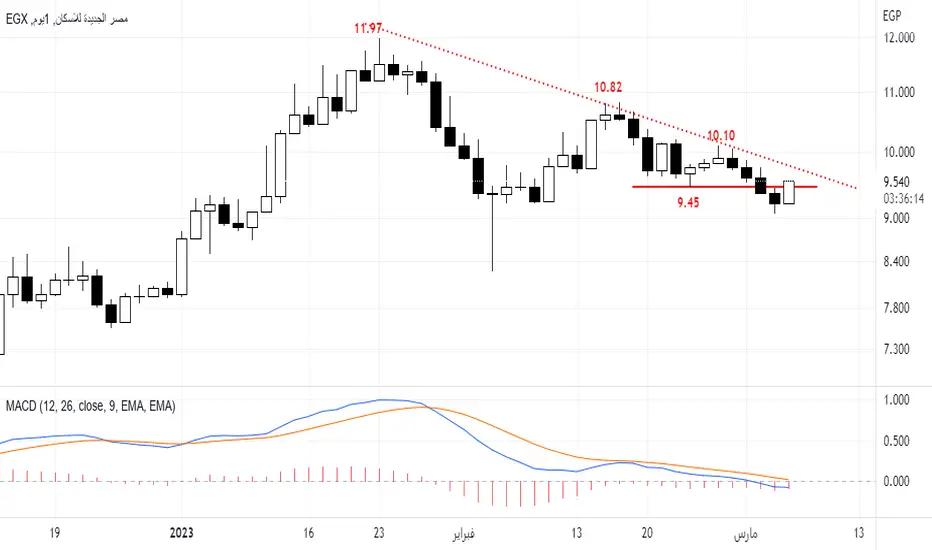 مصر الجديده: على الرسم البيانى اليومى, تستمر الاسعار فى تكوين قمم اقل من سابقتها وتتداول ادنى خط اتجاه هابط, ويكمن مستوى المقاومه الثانوى الحالى عند 9.45 جنيه, والذى فى حاله اختراقه بشكل مؤكد فسوف يؤهل الاسعار على استهداف مستويات صاعده بالقرب من 10.10 جنبه (القمه الثانويه الاخيره), وهو المستوى الذى نحتاج الى اختراقه حتى يتم تسجيل اشاره شراء مع مستهدف اول عند 10.82 جنيه. على الصعيد الاخر, يكمن مستوى الدعم الحالى عند 9.20 جنيه والذى فى حاله كسره سيؤهل الاسعار على المزيد من الانخفاض بالقرب من 8.60 - 8.28
