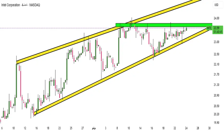 السهم داخل قناة صاعدة منتظمة منذ منتصف يونيو، ويواجه مقاومة أفقية قوية عند مستوى 23.90.