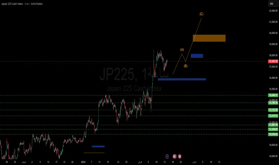 السلوك الحالي يشير إلى نموذج تصحيحي (A)(B) تمهيدًا لموجة (C) صاعدة، بشرط الحفاظ على قاعدة 56,000.