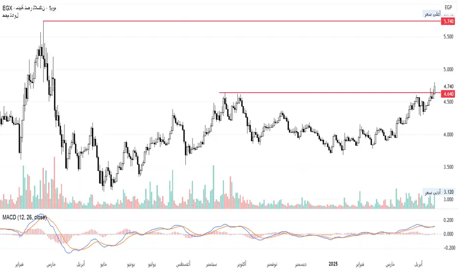 شهد السهم ارتفاعاً قوياً خلال الاسبوع الماضى ليستطع اختراق المقاومه الرئيسيه المتكونه عند 4.64 جنيه, ومن ثم فى حاله ابقاء التداول اعلى هذا المستوى, فسوف يأكد الايجابيه, مما سيدفعه لمزيد من الارتدات قرب 4.90 - 5.19 - 5.40 - 5.74 جنيه.