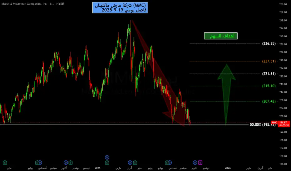 الدعم الرئيسي: 195.42$ (50% فيبوناتشي).