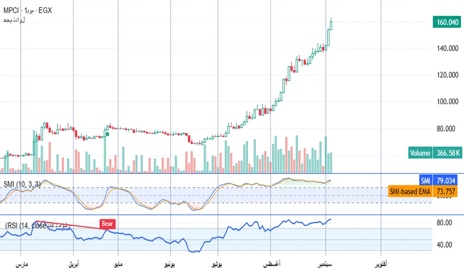 يُظهر الشارت أن سهم ممفيس للأدوية يتداول في اتجاه صعودي قوي واضح، وقد حقق ارتفاعات كبيرة ومتواصلة في الفترة الأخيرة. السهم حاليًا يتداول عند مستويات قياسية تاريخية، مما يجعله في منطقة ذروة شراء ويواجه ضغطًا لجني الأرباح.
