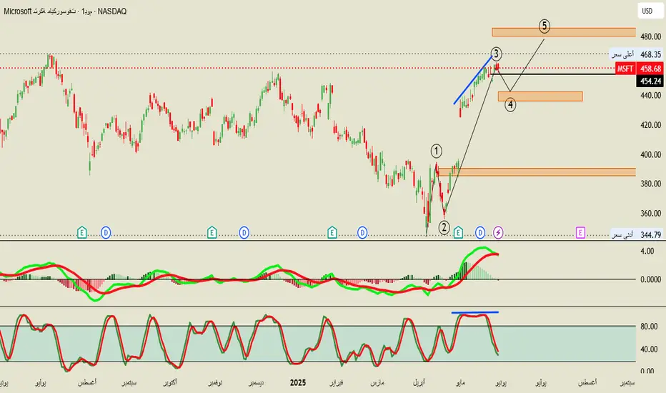 تخليل سهم MSFT يومي كسر 454.24 مع وجود ديفرجنس يناكد هبوط للموجة الرابعة والله اعلم ومنها صعود للموجة الخامسة والله اعلم كل شيء على الشارت
