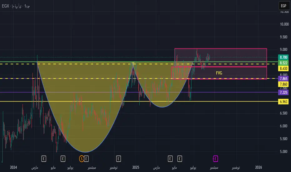 يتواجد السهم حاليًا أعلى منطقة الفجوة السعرية (FVG) بين 8.43 – 7.86 جنيه، واستمرار التداول فوقها يعزز فرص استكمال الاتجاه الصاعد.