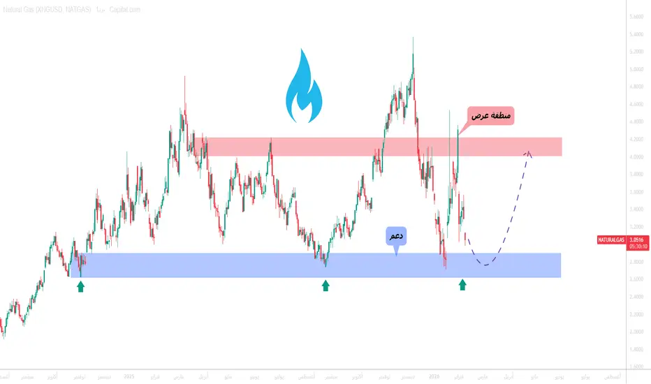 الغاز الطبيعي يتحرك داخل نطاق واضح، ومع الهبوط الأخير عاد السعر لاختبار منطقة الدعم الرئيسية باللون الأزرق 💪