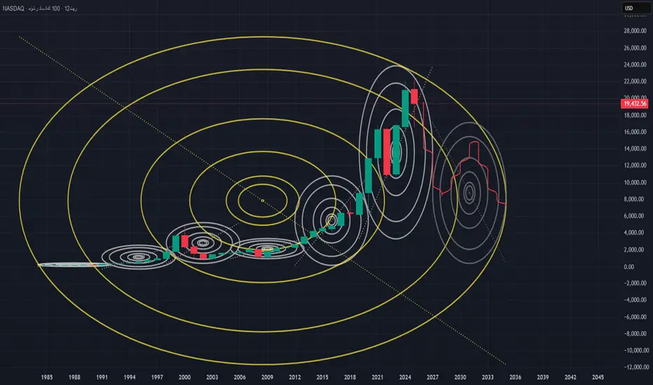 الرسم يوضح أن ناسداك قد أكمل دورة زمنية كبرى، ومعطيات الكون الجديد تُشير إلى احتمالية دخول السوق في تصحيح عميق مستمر على مدى سنوات قادمة.