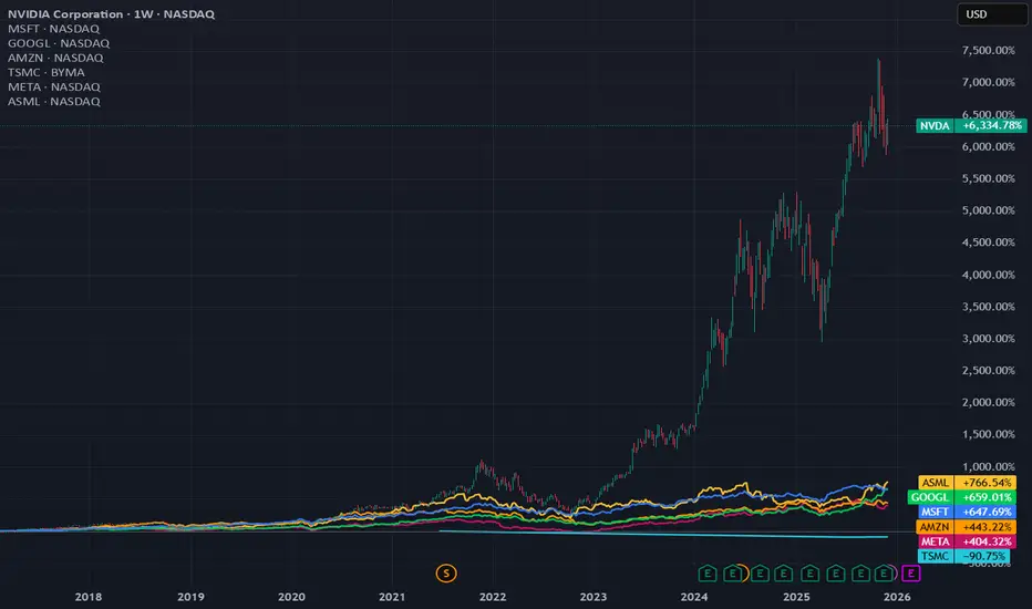This chart presents a long-term analysis of the cumulative return of the most influential stocks in the technology ecosystem, focusing on companies central to Artificial Intelligence (AI) infrastructure and application.