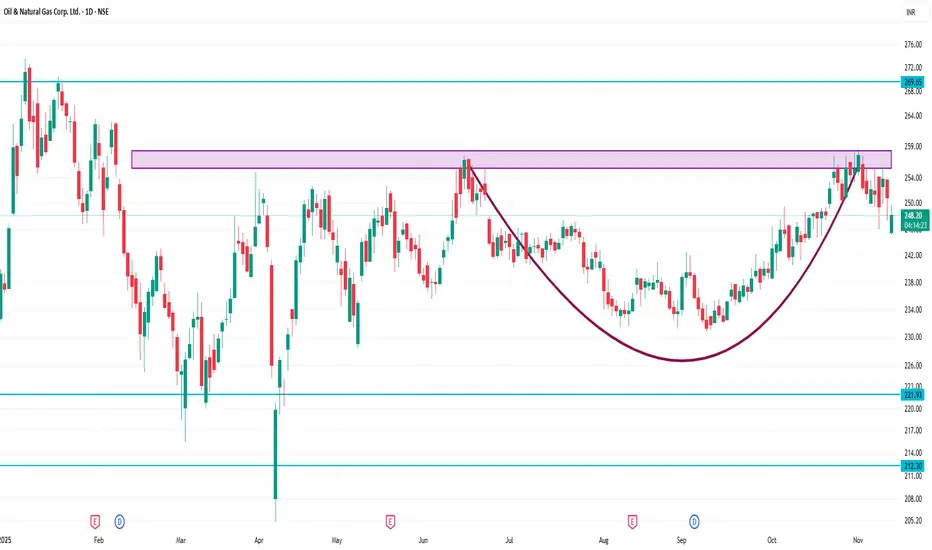 If ONGC breaks down below ~₹ 243 (support zone) with volume, possible further drop toward ~₹ 241 or ~₹ 225 in longer term.