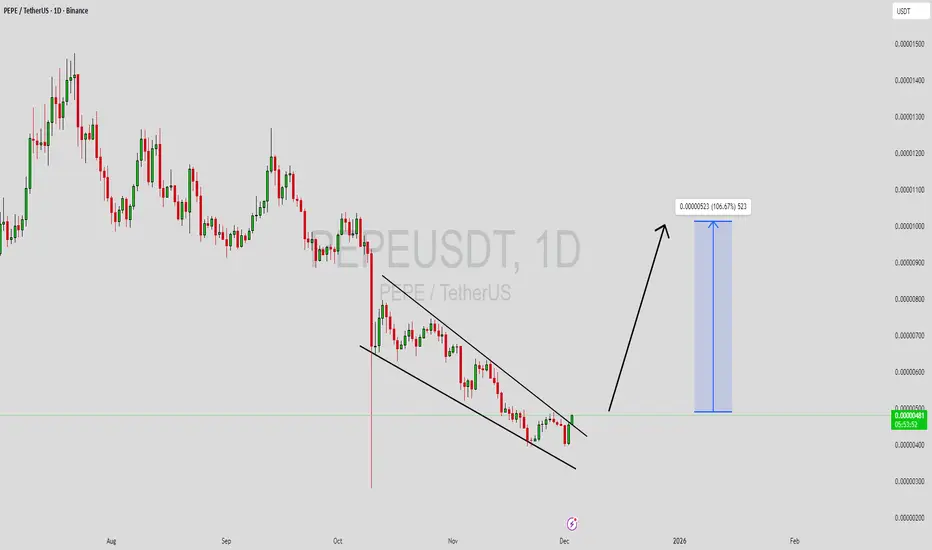 PEPEUSDT is forming a clear falling wedge pattern, a classic bullish reversal signal that often indicates an upcoming breakout. The price has been consolidating within a narrowing range, suggesting that selling pressure is weakening while buyers are beginning to regain control. With consistent volume confirming accumulation at lower levels, the setup hints at a potential bullish breakout soon. The projected move could lead to an impressive gain of around 90% to 100% once the price breaks above the wedge resistance.