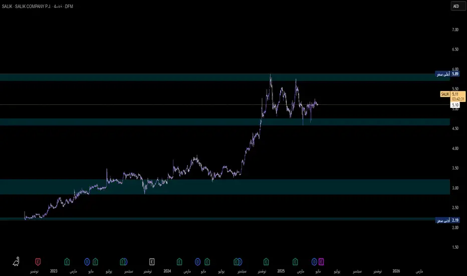 الرسم البياني اليومي لسهم SALIK (DFM) يُظهر منذ أواخر 2022 حركة صعودية واضحة من مستوى 2.19 إلى حوالي 5.11 درهم، مع تشكّل عدة مناطق دعم ومقاومة مستندة إلى ردود فعل السعر التاريخية: