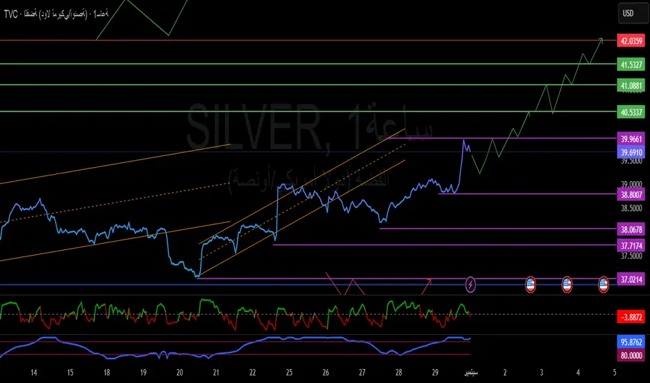 الفضّة كسرت صمتها بعد تماسك طويل وأطلقت اندفاعة قوية من 38 لتصل الآن إلى مشارف 40. الاتجاه العام صاعد بوضوح، والقناة الجديدة تدعم مسار السيطرة.