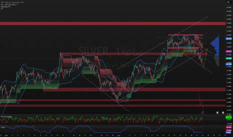 الفضة تقف اليوم كما يقف المحارب بين خيارين: الهجوم أو التراجع. خطوط الاتجاه، قنوات السعر، ومناطق السيولة تكشف عن صراع داخلي بين البائعين والمشترين، وكأن السوق يحبس أنفاسه قبل القرار الأخير.