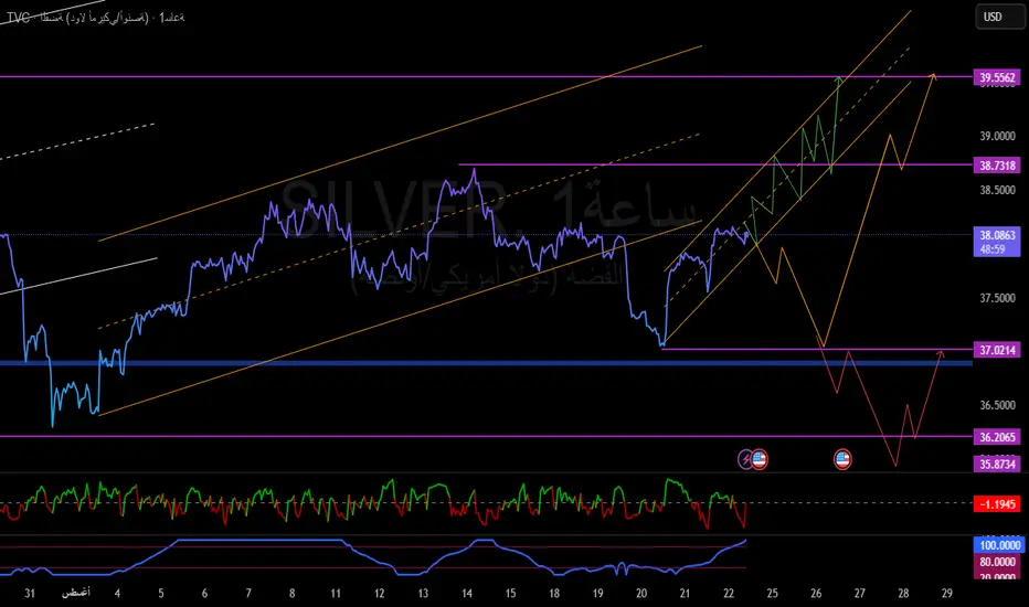 الفضة تتداول في قناة صاعدة قصيرة المدى (الخطوط البرتقالية)، بعد ارتداد قوي من الدعم 37.02$.
