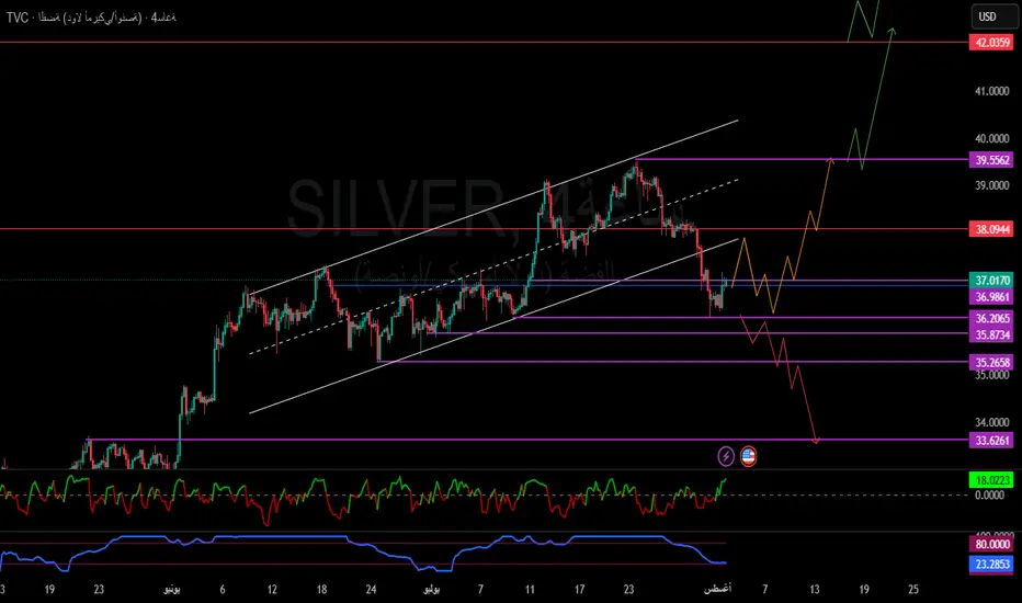 يتم تداول الفضة حاليًا قرب مستوى 37.017، بعد كسر واضح للقناة الصاعدة.