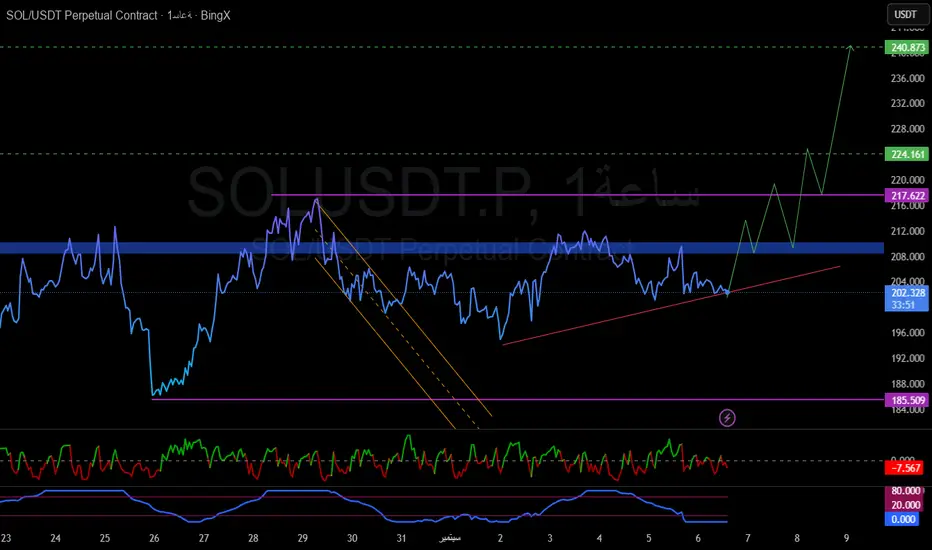 سولانا بعد كسر القناة الهابطة (باللون البرتقالي) نجح في الارتداد من قاعدة 185.5 ليؤكد بداية مسار صاعد. السعر الآن يتحرك فوق خط ترند صاعد (أحمر) وداخل نطاق اختبار لمنطقة عرض قوية عند 208.