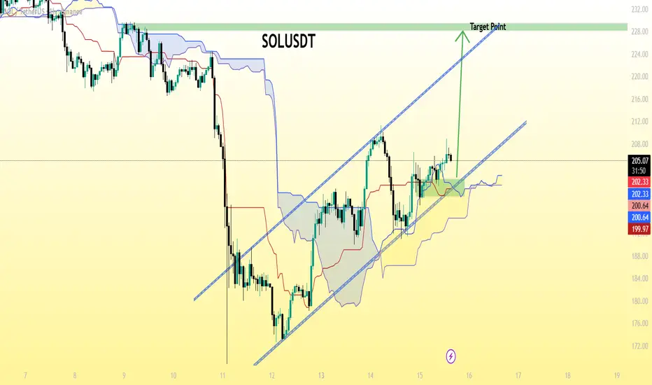 ⚠ Note: Watch for support around 200–202 USDT (the Ichimoku cloud zone). If SOL holds that level, continuation toward 230 looks likely. A breakdown below the trendline could invalidate the move.