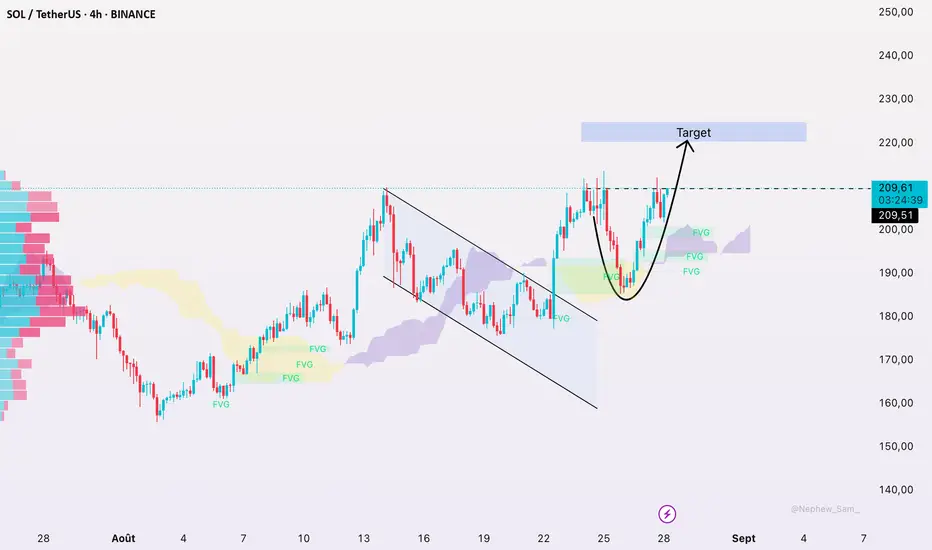 Sur le graphique H4 de SOL/USDT, le prix poursuit une tendance haussière soutenue et approche désormais la résistance à 208 $. Après un rebond sur le support FVG à 195 $, SOL a franchi plusieurs résistances et continue son ascension. Les zones FVG de 195 $ à 205 $ servent de supports solides, maintenant le momentum haussier. Tant que SOL reste au-dessus de 205 $, un test de 208 $ est très probable. Le nuage Ichimoku situé sous le prix indique que la pression acheteuse demeure forte. La structure des prix montre également un schéma de reprise en V, avec des sommets successifs de plus en plus hauts, renforçant la tendance haussière.