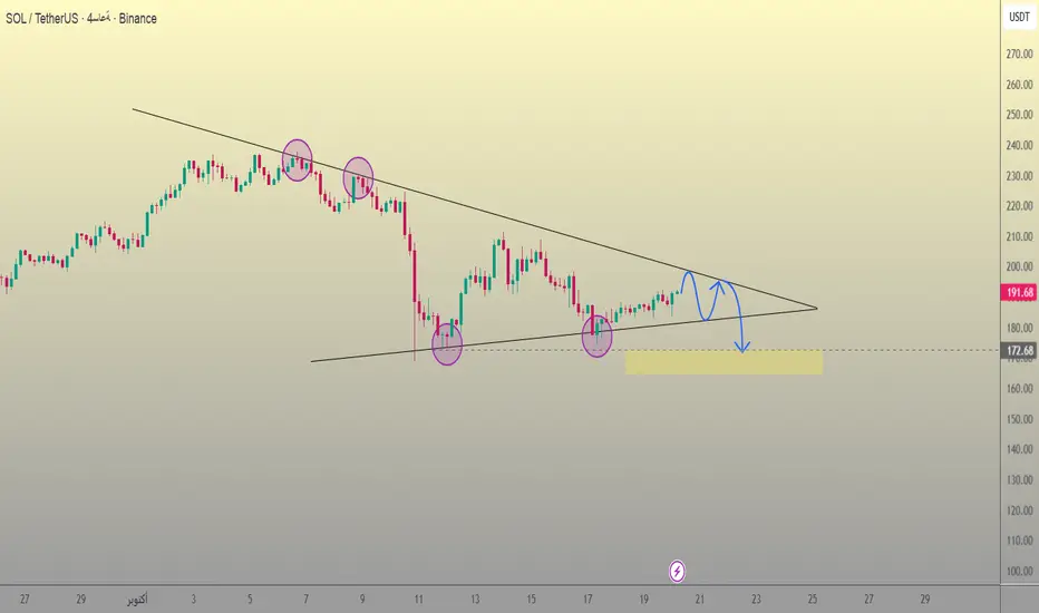 يظل SOLUSDT محصورًا تحت خط الاتجاه الهابط، مما يشير إلى أن البائعين لا يزالون يسيطرون على السوق. من المحتمل أن يشهد السعر ارتدادًا طفيفًا نحو منطقة 197–198 دولارًا قبل أن يُرفض مجددًا، ليواصل بعدها الهبوط نحو 172 دولارًا، وهي منطقة دعم قوية سابقة.