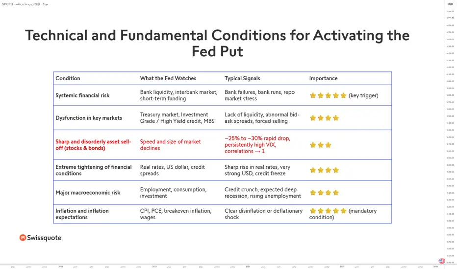 • يصبح “Fed Put” قابلاً للتفعيل إذا هبط مؤشر S&P 500 بأكثر من 20–30% خلال فترة زمنية قصيرة جداً، وكان التضخم غير مرتفع بشكل كبير فوق هدف الفيدرالي