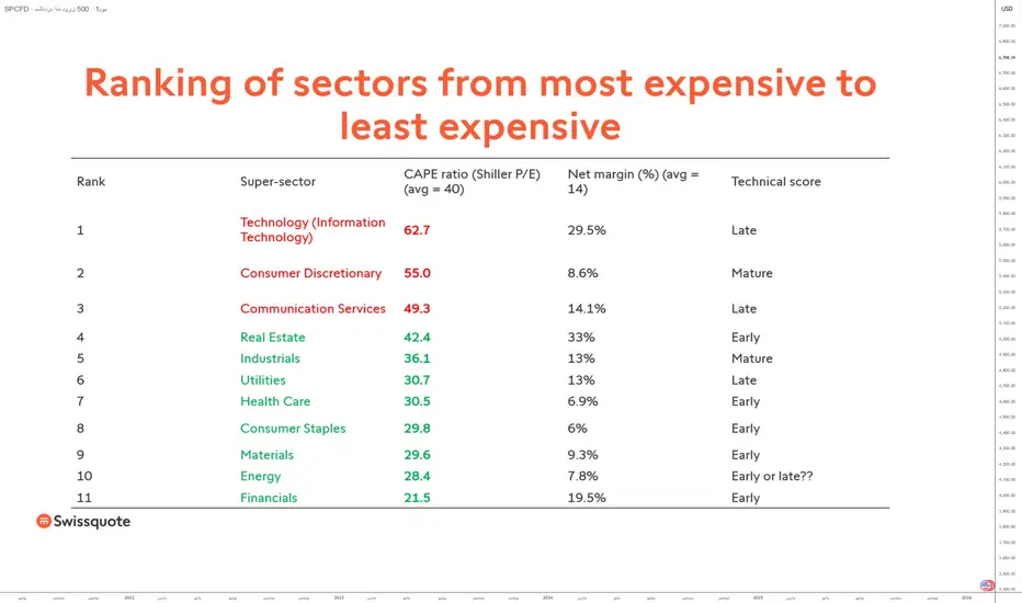 منهجية التحليل المطبقة على القطاعات الكبرى الإحدى عشرة لمؤشر S&P 500: نسبة CAPE + هامش الربح الصافي + متوسط التقييم الفني على المدى المتوسط/الطويل