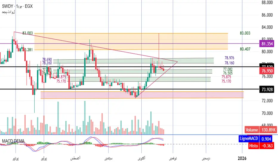 افضل فرصة للشراء فى حالة هبوط الى مستوى الدعم الاول مستوى 75 او فى حالة اختراق وتأكيد لمستوى المقاومة العلوى