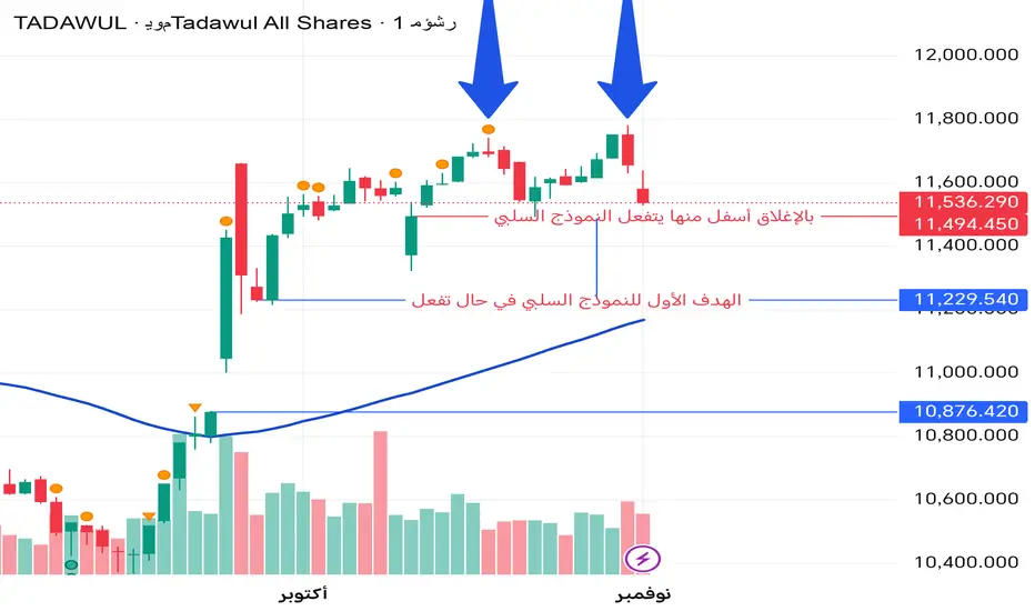 الرسم البياني يعرض مؤشر تداول العام، ويظهر تكون نموذج فني واضح يُعرف بـ"القمة المزدوجة"، وهو من النماذج الانعكاسية السلبية، مما يُشير إلى احتمال فقدان الزخم الصعودي وبدء تصحيح هابط إذا تم كسر الدعم الرئيسي أسفل النموذج.