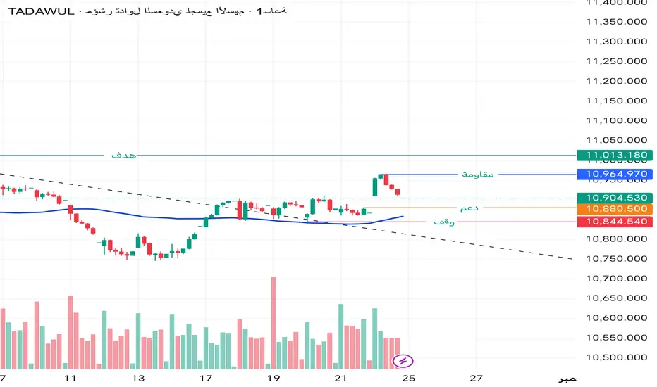 على فاصل الساعه فالمؤشر العام قد يذهب نحو اغلاق الفجوه الى مناطق الدعم الموضحه على الرسم البياني وقد يلامس الوقف ولكن المهم ان لا يغلق اغلاقا يوميا اسفل الوقف، لانه اذا حصل ذلك فالمؤشر سيواصل النزيف والنزول الى نقاط ابعد، وانا استبعد هذا السيناريو الا وهو النزول الى مناطق بعيده، واتمنى ان ينزل الى مناطق الدعم حتى يغلق الفجوه، وفي حال حصل هذا فلعلنا نشهد موجه ارتداديه ممتازه تؤكد حصول الانعكاس والذهاب نحو مناطق 11,000 نقطه، والتي في حال ثبت اعلى منها المؤشر العام فهذا يؤكد الانعكاس الايجابي.